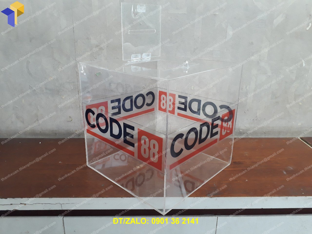 Thùng rút thăm mica 40: Kích thước: 40cmx40cmx40cm, chất liệu: Mica Đài Loan trong 3ly.