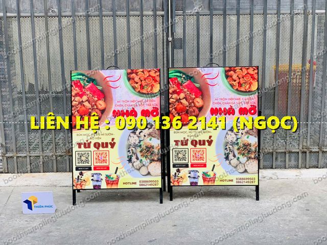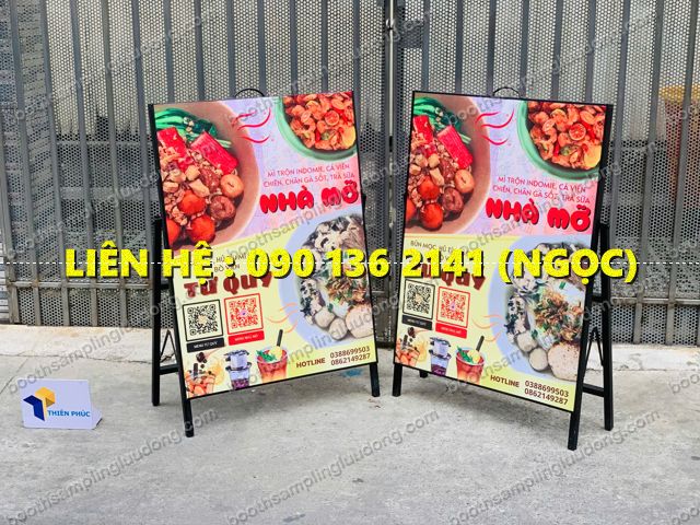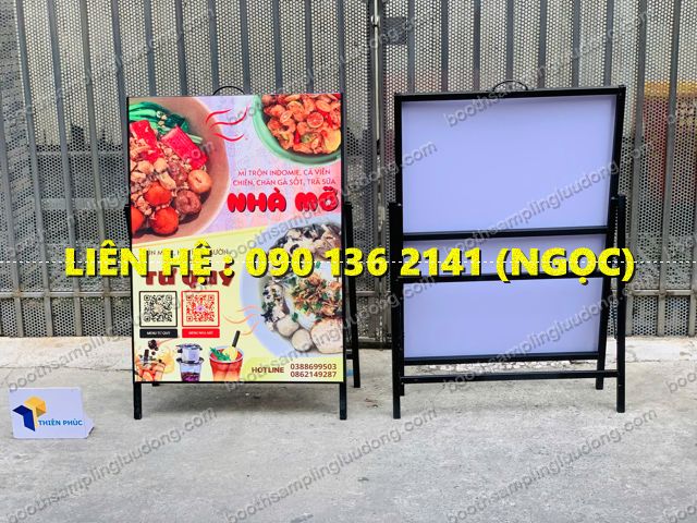 Xưởng Thiên Phúc chuyên: standee A chân xếp, standee chữ A 1 mặt – 2 mặt, standee khung sắt, standee menu, booth bán hàng, vòng quay quảng cáo.