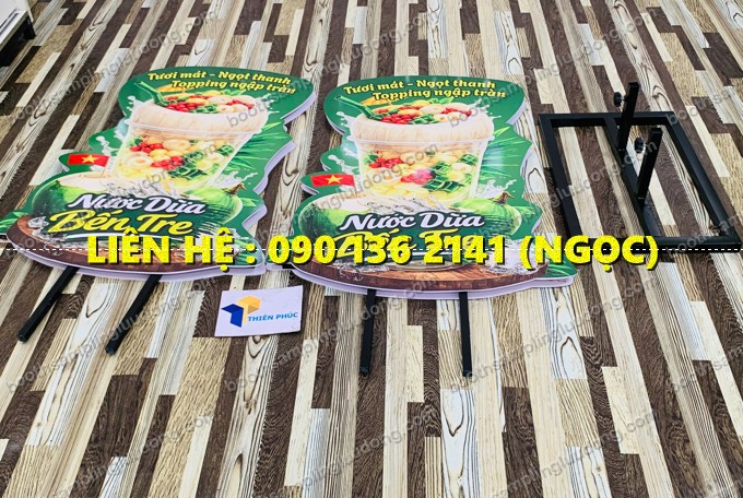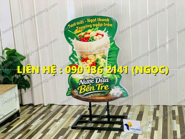 Bề mặt standee có thể cắt CNC theo hình ly nước dừa, tạo hiệu ứng 3D chân thực và nổi bật hơn bảng quảng cáo thông thường.