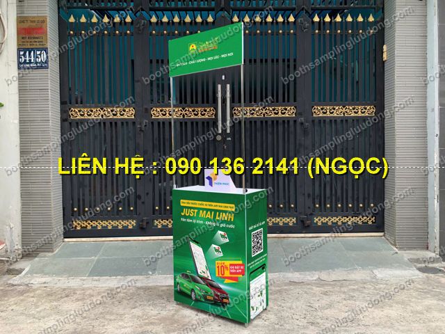 Booth sampling thường được làm từ sắt hộp nhẹ, có thể tháo lắp nhanh, bỏ gọn trong túi xách hoặc thùng carton, phù hợp cho nhân viên đi sampling nhiều điểm khác nhau.