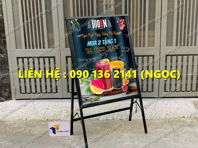 Standee khung sắt chữ A là loại standee có thiết kế dạng chữ A, có thể đứng vững trên mặt đất, thường dùng để trưng bày thông tin, menu, chương trình khuyến mãi, chỉ dẫn hoặc quảng cáo trước cửa hàng.