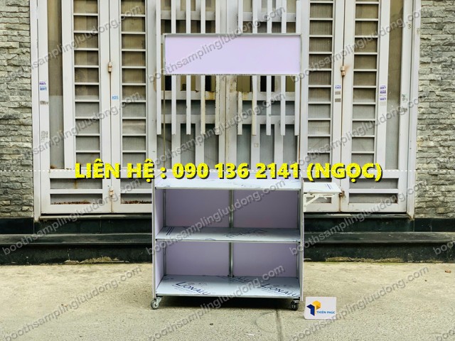 Tủ thường được làm từ khung sắt, inox, mặt gỗ hoặc mica, có bánh xe di chuyển, phù hợp với nhiều không gian bán hàng khác nhau.