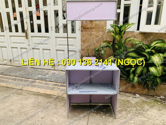- Booth khung sắt trưng bày là quầy giới thiệu sản phẩm có khung được làm từ sắt sơn tĩnh điện chắc chắn, kết hợp với mặt bàn mica, alu hoặc nhựa cứng để trưng bày hàng hóa, tờ rơi, sản phẩm mẫu hoặc vật dụng quảng cáo.