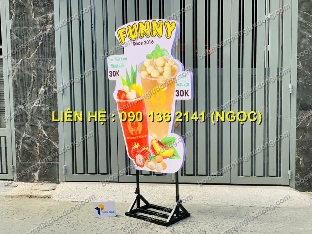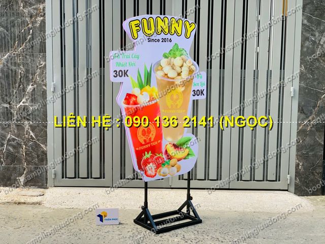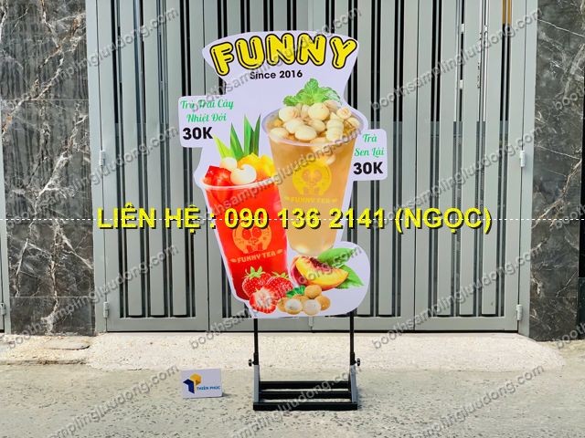 Standee hình ly 3D là loại standee được cắt tạo hình theo dáng ly nước (trà sữa, cà phê, nước ép, soda…), in hình ảnh sắc nét và có độ dày tạo cảm giác nổi khối. So với standee phẳng, standee 3D mang lại cảm giác chân thực và bắt mắt hơn rất nhiều.
