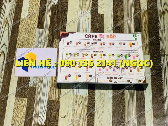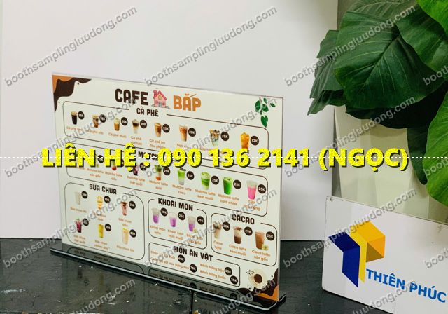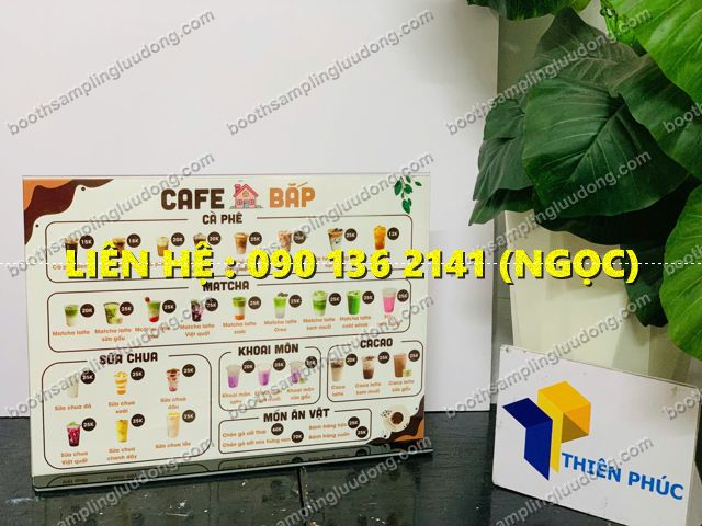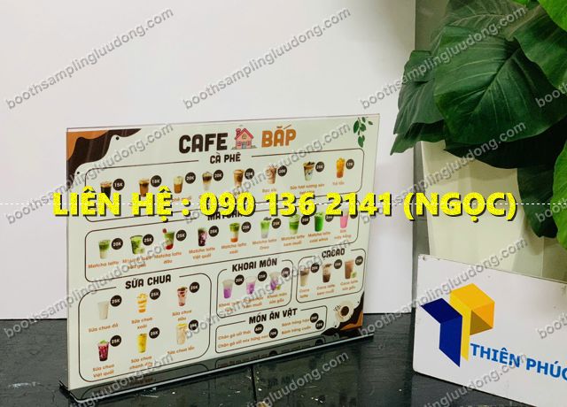 Menu mica để bàn là sản phẩm trưng bày menu được làm từ mica trong suốt hoặc mica màu, thiết kế: