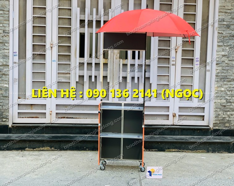 Xe bánh mì que gắn dù che là mẫu xe bán bánh mì que được thiết kế thêm dù quảng cáo phía trên. Phần dù giúp che nắng, chắn mưa nhẹ, đồng thời có thể in logo, tên quán hoặc thông điệp bán hàng, giúp tăng nhận diện thương hiệu.