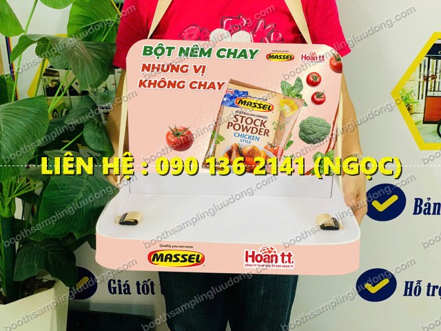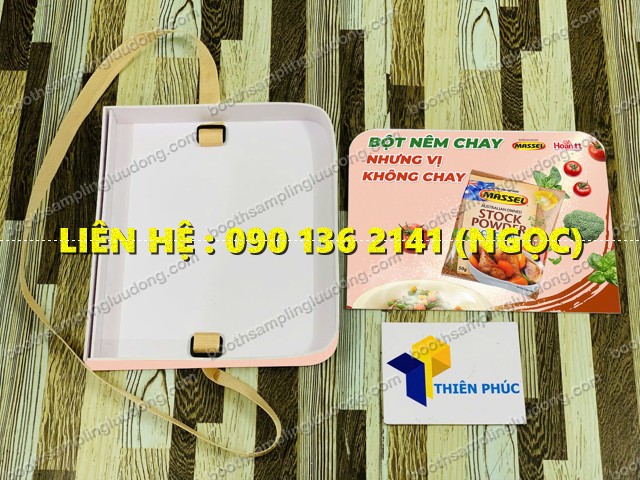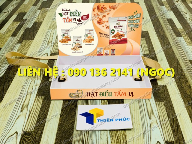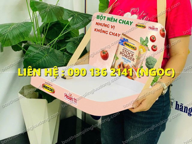 Khay sampling cầm tay là loại khay quảng cáo có dây đeo qua cổ hoặc vai, dùng để đựng sản phẩm mẫu như: