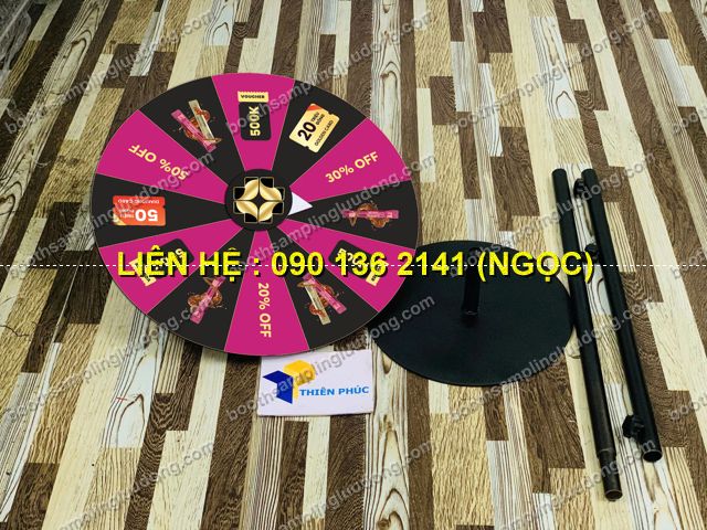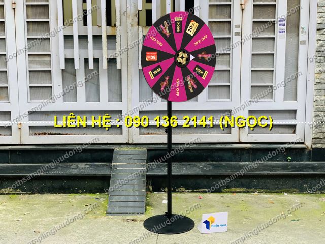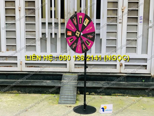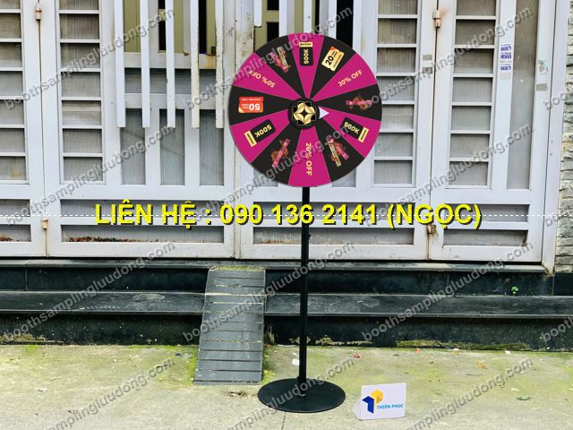 - Vòng xoay chân đứng quảng cáo là mẫu vòng quay trúng thưởng có thiết kế chân trụ cố định, dễ trưng bày tại các vị trí như cửa hàng, siêu thị, hội chợ, showroom, trung tâm thương mại.