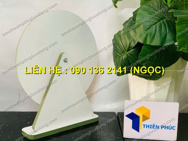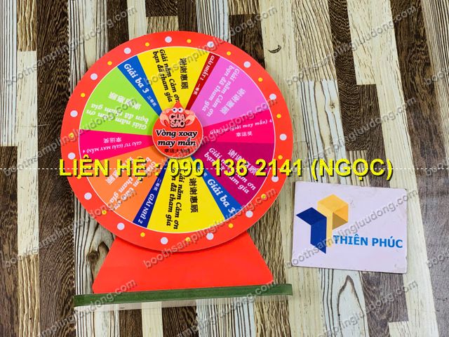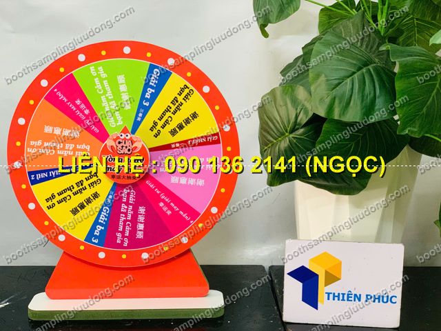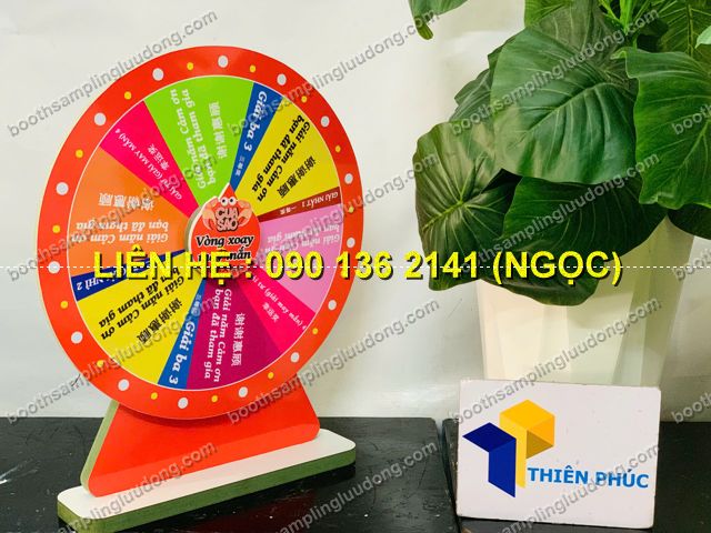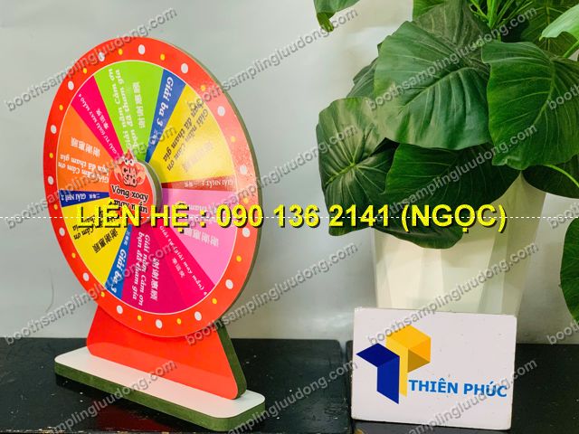 - Vòng quay chân gỗ mini để bàn là phiên bản nhỏ gọn của vòng quay may mắn, được thiết kế bằng chân gỗ chắc chắn – mặt vòng in màu sắc nổi bật. Đây là sản phẩm chuyên dùng cho minigame tại quầy bán hàng, booth giới thiệu sản phẩm, sự kiện nhỏ, quán cafe, cửa hàng tiện lợi, showroom, ngày hội sampling.