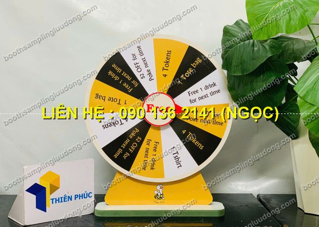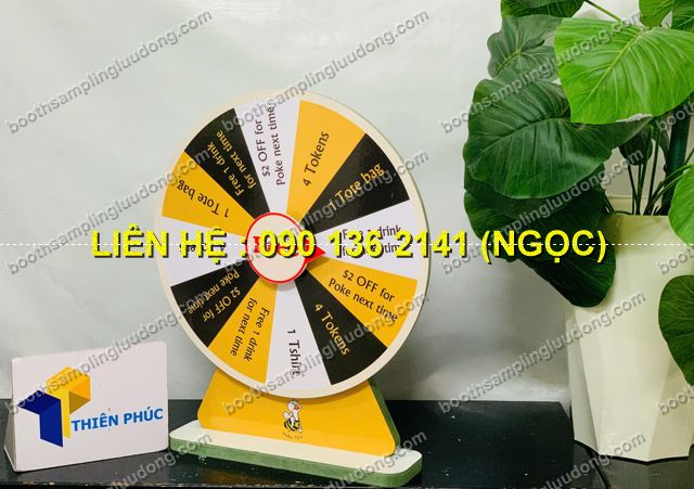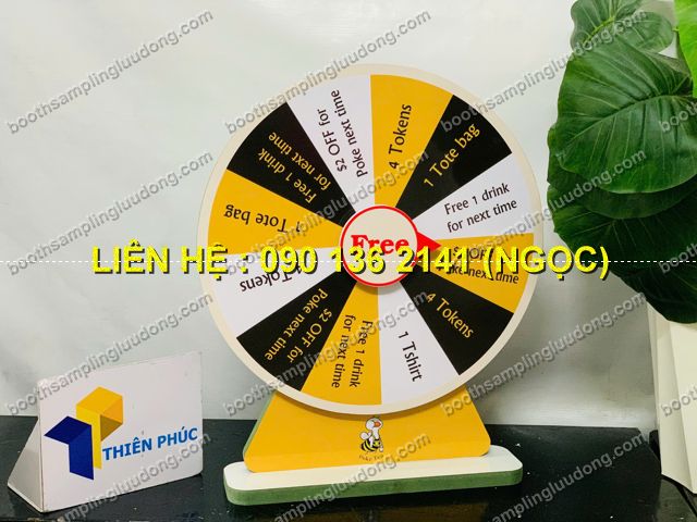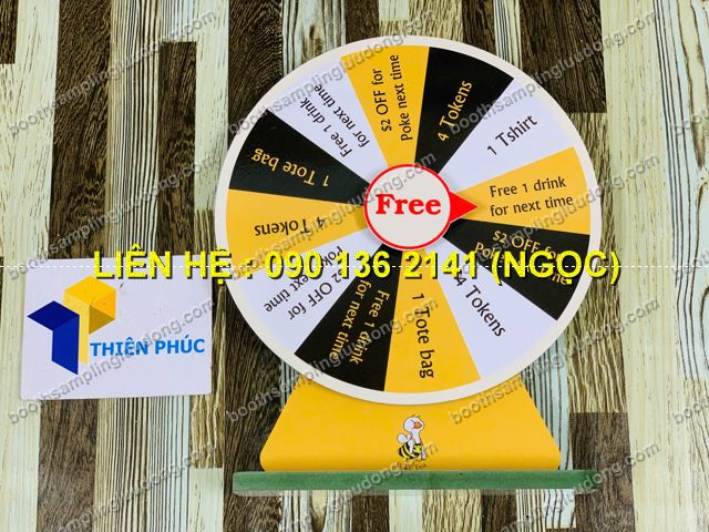 - Vòng quay gỗ để bàn rẻ là dụng cụ mini game quảng cáo được thiết kế bằng chất liệu gỗ bền đẹp, kích thước nhỏ gọn, đặt dễ dàng trên bàn làm việc, quầy lễ tân, booth sự kiện hay quầy bán hàng.