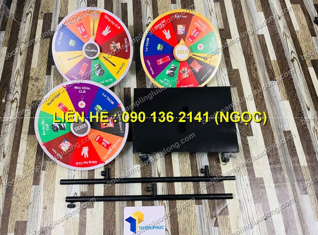 Vòng quay sự kiện có bánh xe là dạng vòng quay trúng thưởng được gắn trục xoay và bánh xe giúp chuyển động mượt mà, nhẹ lực, phù hợp cho mọi hoạt động minigame. Bánh xe được thiết kế chia ô màu, kèm nội dung phần thưởng rõ ràng, giúp người chơi dễ theo dõi và tăng sự hứng thú.